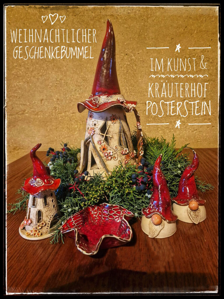 Keramik, Schmuck, Malerei, Papeterie, Kalender, Glasperlenschmuck, Gefilztes, Genähtes, Gehäkeltes, Wolliges, Holziges, Messer, Geschmiedetes, Kerzen, Kräuter-liches, Seife, Honig und Honigprodukte
